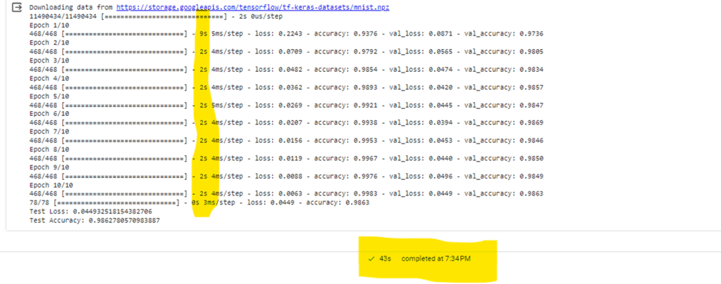 After verifying GPU availability and switching my runtime in Colab, I followed similar steps to train and evaluate the model with minor adjustments to enable GPU access. The entire process took approximately 43 seconds.