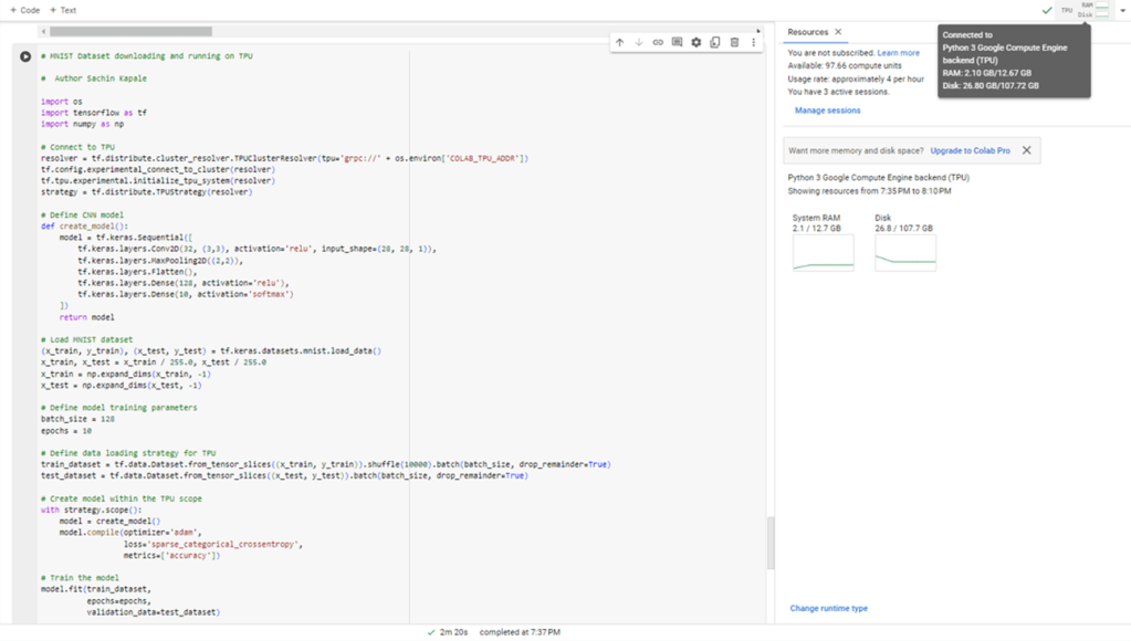 - Once you subscribe to Google Cloud, TPUs become available to you. Here I am using Colabnet.